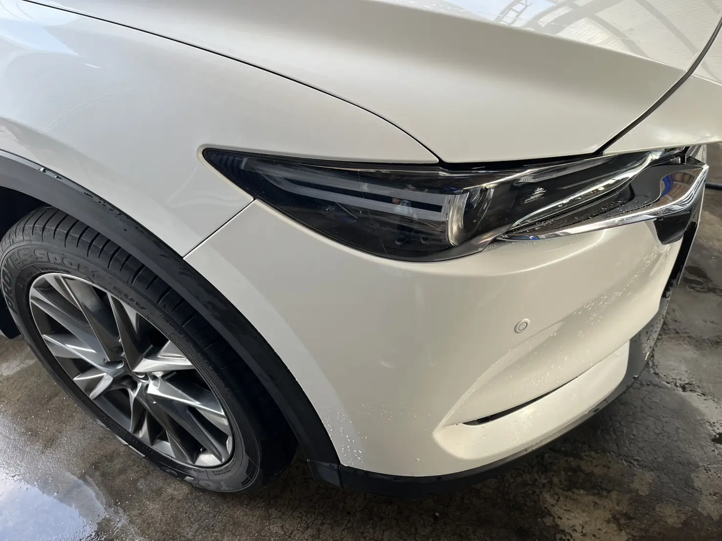 お車は大切に乗られている真っ白なRX-8でしたが、フロントバンパー右側に目立つ黒いキズと塗装剥がれができてしまったとのことで、ご相談をいただきました。